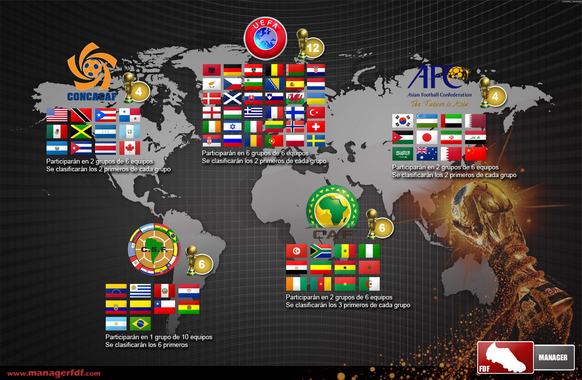 CONCACAF: 12 selecciones participantes en 2 grupos de 6 selecciones. Se clasifican las 2 primeras.