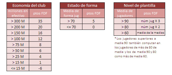 La valoración FDF se emplea en el juego para establecer objetivos a los managers que llevan más de 10 partidos disputados con su equipo actual al inicio del mes de Agosto.